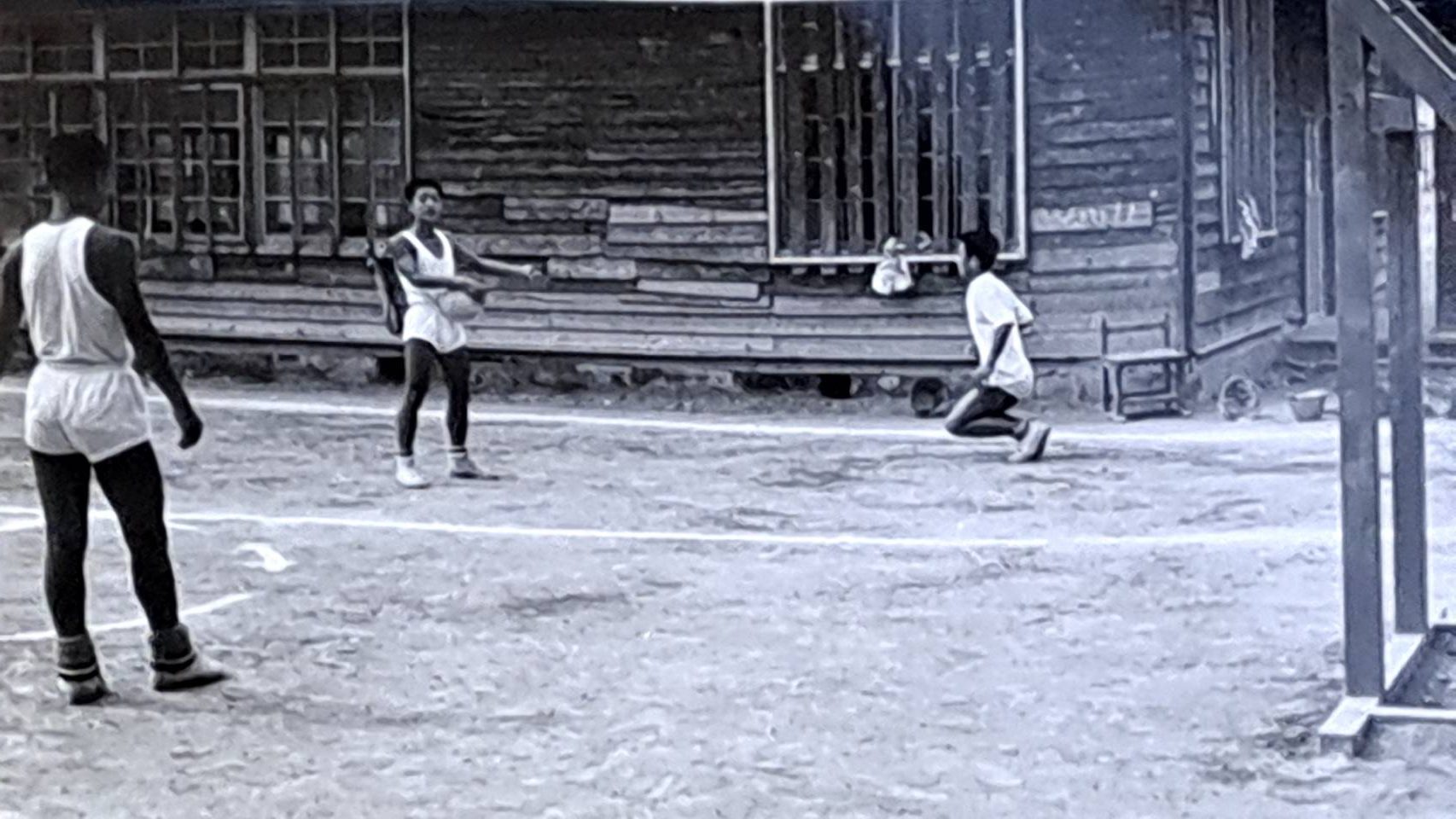 城内中学では体育館が未だ無くて(当然、プールも無かったので夏の暑くて練習で汗をかいた後、隣の付属中学のプールに飛び込んで、守衛さんが走って捕まえに来たが、その前に逃げた。)、グラウンドにリングを置いてある処で、練習を行なっていた。