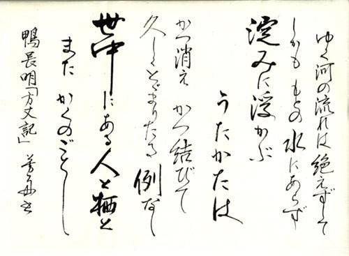 『行く川のながれは絶えずして、しかももとの水にあらず。よどみに浮ぶうたかたは、かつ消えかつ結びて久しくとどまることなし。。。』