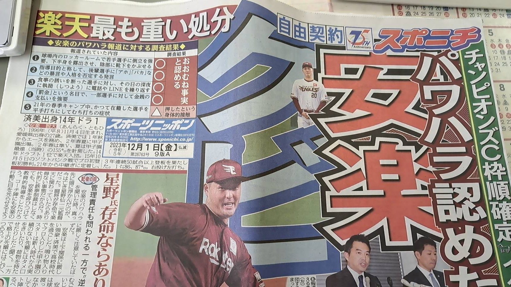 12月1日のスポーツ新聞には、楽天の安楽選手のパワーハラスメント問題が発表され「自由契約」となった。